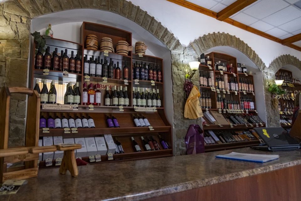 Магазинчик оказался весьма уютным. Продавец не торопясь рассказала о местном виноделии, так как клиентов совсем не было. Цены невысокие — 250 рублей за столовое вино и от 500 руб за вино географического наименования. Купили вина, которые производятся только тут: Меганом и Черный доктор — гордость виноделов Солнечной Долины.