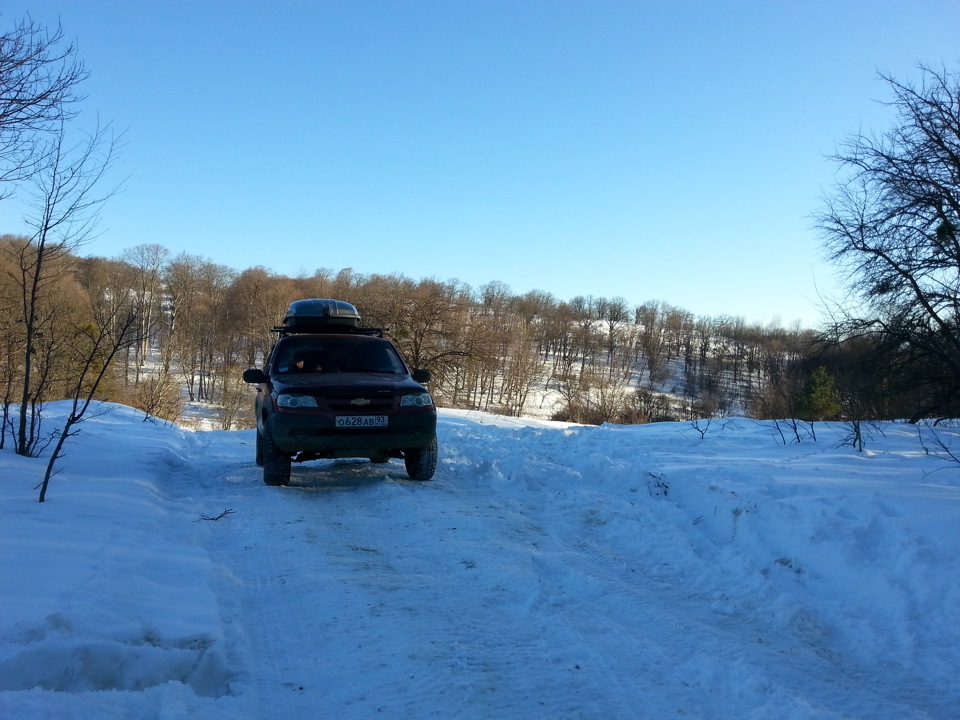 Мы же поехали в обратную сторону через замёрзшие водопады с целью выехать на плато Лаго-Наки. Раньше всегда выезжали через Камышовые поляны. Но они порядком надоели, решили найти новый путь. Как минимум там три ещё дороги. Однако далеко не уехали. Шемик поехал на АТшке и естественно против зимних шин стал большой обузой. АТешка не едет ни по снегу ни по льду в особенности. Там где хоть как-то умудрялся докопаться до грунта — там ехал. Там где лёд, я его тянул. Особенно в горки. Шемик газовал, крутил рулём, тужился как мог и в итоге не выдержала помпа. Итог: под замену помпа, ремень, антифриз — 3500 рубля + работа в два лица на снегу.