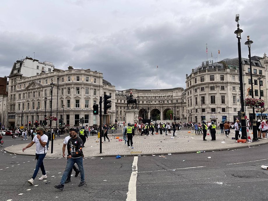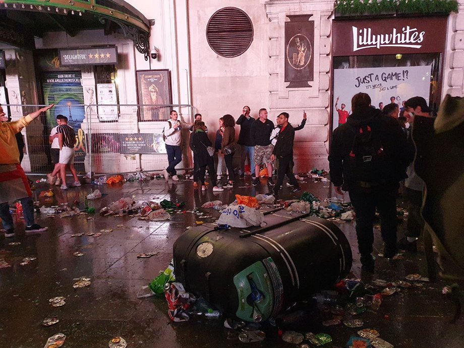 За три часа до финального матча Евро-2020 центр Лондона погряз в стекле от разбитых бутылок, помятых пивных банок и прочем мусоре. Болельщики сборной Англии начали отмечать то ли игру своей сборной в финале, то ли «возвращение футбола домой», то ли уже победу, поэтому район около Leicester square и Piccadilly Circus стал адом.