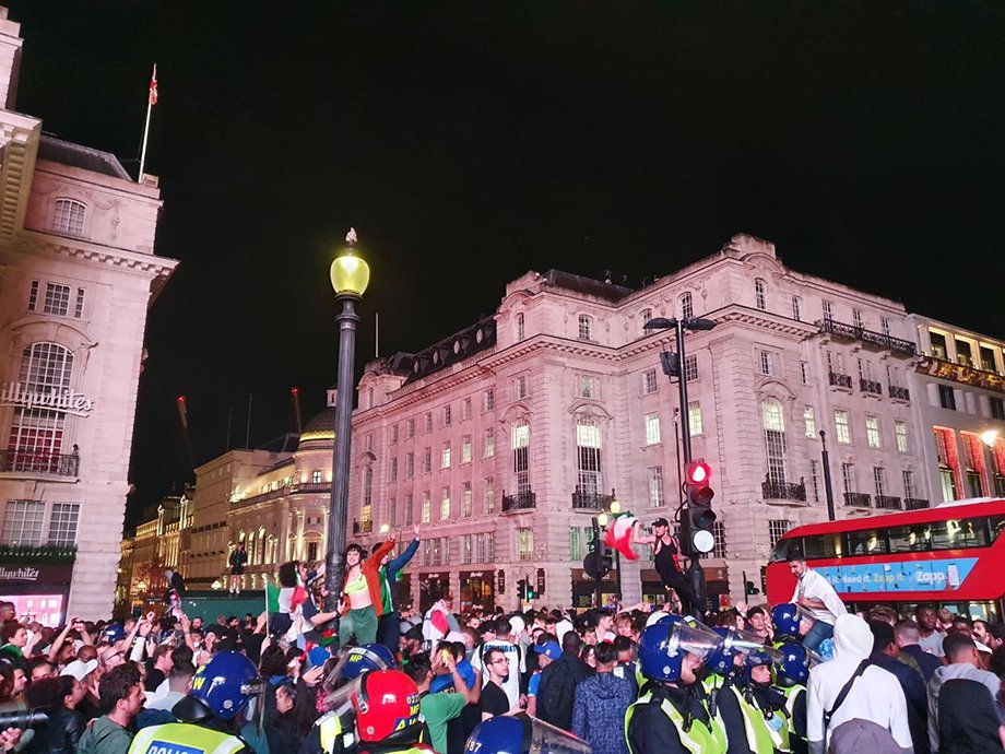 На площади у Piccadilly Circus быстро собрались итальянцы, которые до матча явно где-то прятались, не решаясь показываться пьяным англичанам. Тут они осмелели – и устроили уже свой праздник. В ход пошли файеры, дуделки, бубны и, конечно же, песни.
