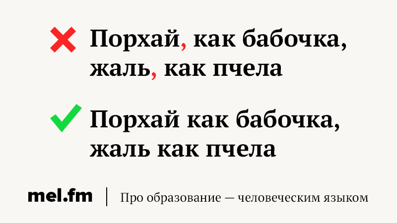 Девиз боксёра Мохаммеда Али, который идеально подходит под наше правило. Оборот с союзом «как» не обособляется, если он выступает в роли обстоятельства образа действия, которое надо отличить от сравнения (опять). Для проверки можно заменить творительным падежом существительного или наречием (порхай бабочкой, жаль пчелой) или задать к обстоятельству вопрос. Вот ещё пример: в школе японский нам преподавали как факультатив. Преподавали как? — Факультативно.