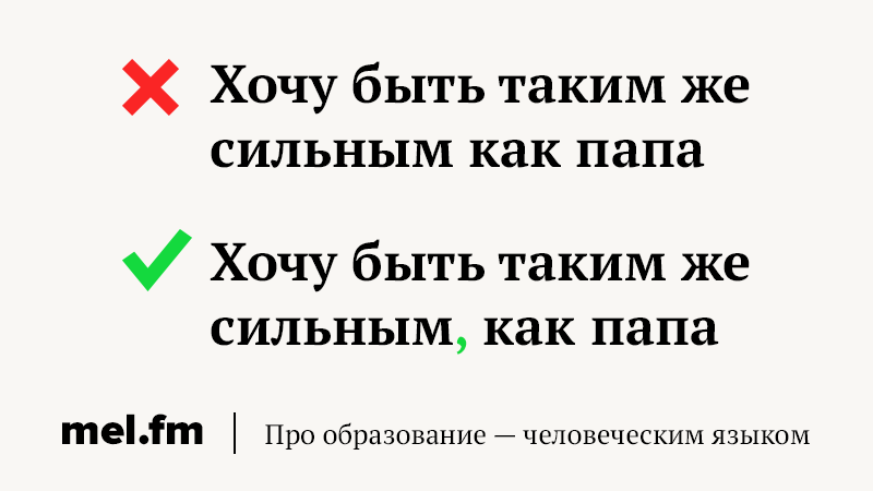 Третий сигнал, кричащий нам о наличии запятой, это оборот с союзом «как и…». Если вы его видите — ставьте запятую и даже не думайте. Часто в этот же оборот входят указательные слова: «Игра так же формирует личность, как и знания», «Гугл, как и мы, может ошибаться». Но с нашими подсказками ошибиться почти невозможно.