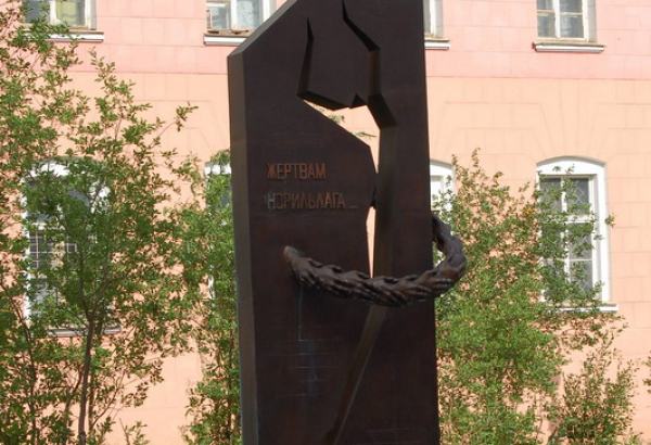 Памятник Жертвам Норильлага был открыт в октябре 2004 года. Памятник представляет собой изломанную фигуру, вросшую в каменную кладку, которая опоясана венком из сплетённых рук. Норильский исправительно-трудовой лагерь был образован в 1935 году и просуществовал 21 год, через него прошло около 400 тысяч человек 22 национальностей. Информация