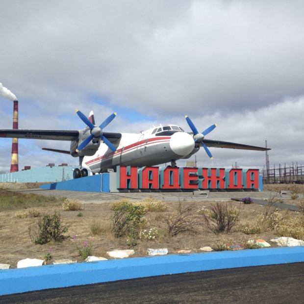 Монумент представляет собой самолёт АН-26. Он установлен на месте первого аэродрома Норильска, строительство которого началось в 1945. Аэродром назвали Надежда. В 1965 году аэродром был закрыт в связи с вводом в эксплуатацию нового аэропорта Алыкель, а в конце 70-х годов XX века на месте взлётно-посадочной полосы был построен металлургический завод. Информация