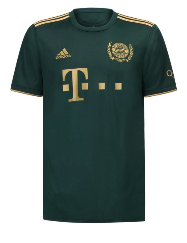 Футболки комплекта выполнены в темно-зеленой расцветке. Логотип, акценты на рукавах, три полосы на плечах и спонсоры выделены золотистым цветом. Изюминкой формы является вышивка, вдохновленная баварскими традициями, которая украшает логотип клуба. Типичный для Октоберфеста альпийский эдельвейс также изображен в области шеи.