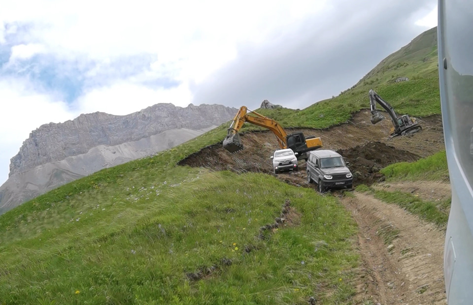 Когда строители поняли, что мы хотим проехать дальше, они минут 20 ковшами разравнивали и приминали те кучи что накопали и намесили гусеницами. Перед нами, для нас трёх экипажей построили дорогу. Ну как дорогу, проезд на первой пониженной с проверкой углов рампы.
