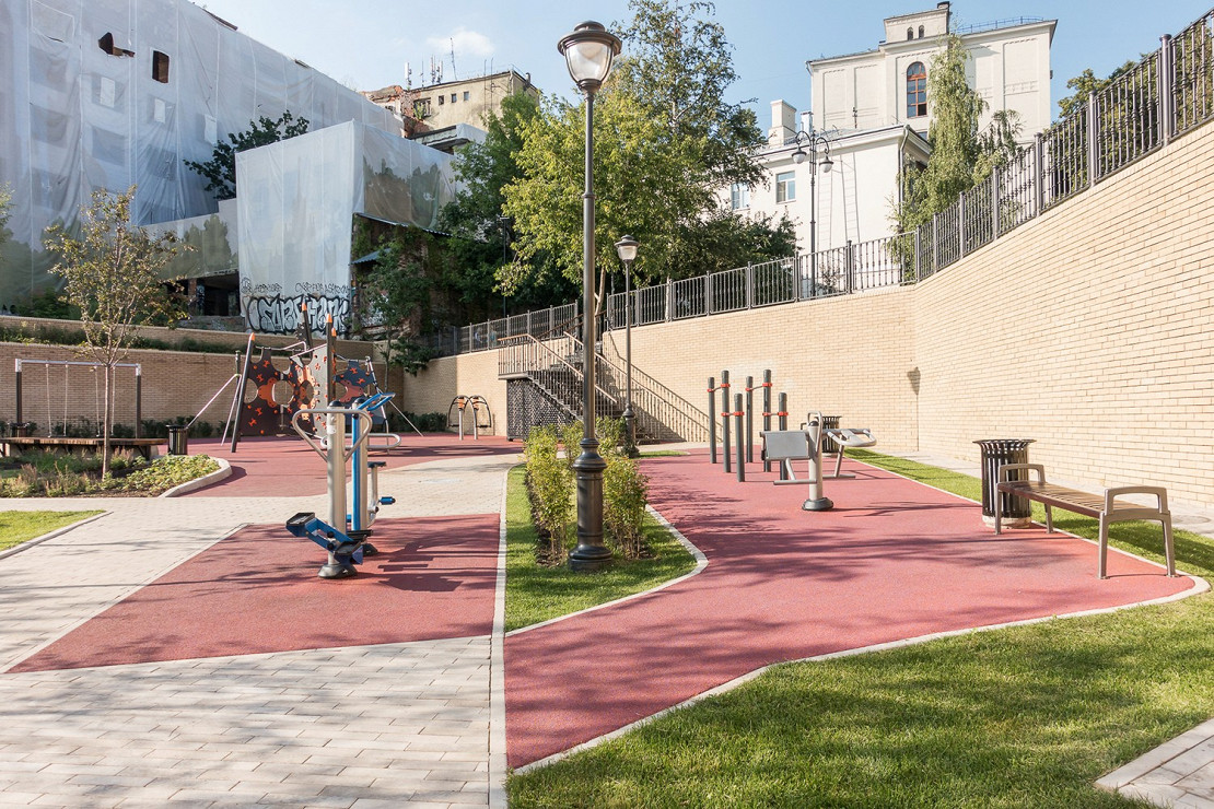 Со стороны Большого Спасоглинищевского парк кажется компактным и совсем небольшим, хотя по проектной документации тут порядка 3 гектаров. Пространство разнесено на три уровня и поделено на семь зон, часть из которых не видно за зданиями. Чтобы обойти все, нужно, прикинувшись гномиком с гравюр Эшера, несколько раз подняться и опуститься по разным лестницам и пройти через соседние подворотни. Эти сквозные проходы — одна из гордостей местных жителей, которые считают себя соавторами планировки вместе с бюро «Мэгли проект». Их завалили и застроили в 90-е многочисленные арендаторы, закрыли заборами и загородили самостроем. Теперь по дворам и подворотням можно гулять всем без страха прослыть подозрительной личностью.