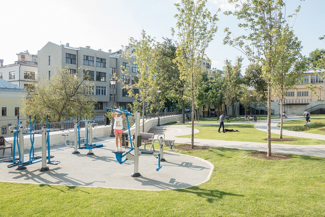 В воскресенье после дождя в парке людей не много. Маленькая девочка лазает по синей футуристической тарелке, ее мама сидит на лавке в телефоне. Слева от паутинки-лазалки просыхает травяной холм, справа на нижнем уровне ребята отжимаются на брусьях.