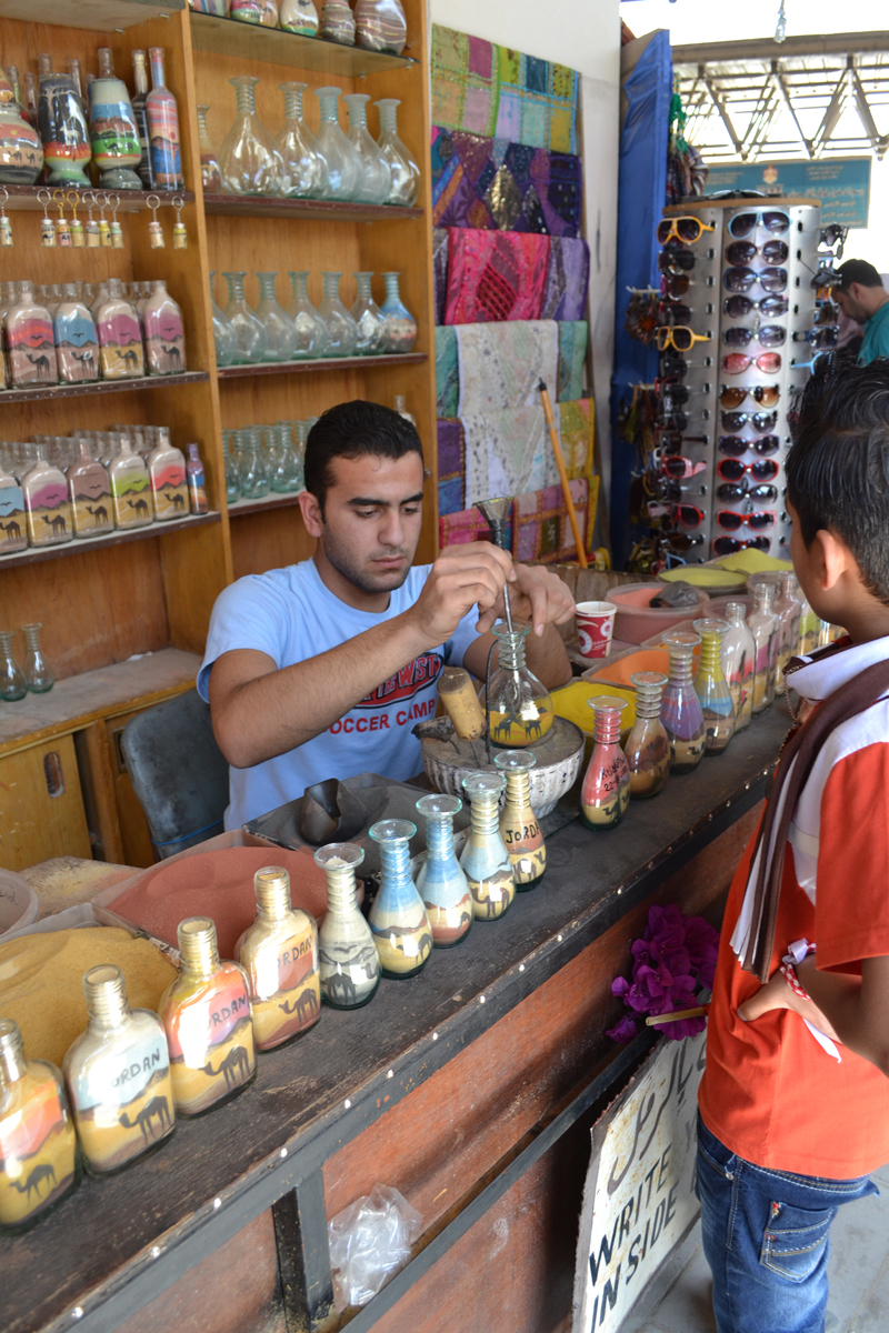 Во время вашего нахождения в Петре, торговцы будут предлагать приобрести самодельные декоративные бутылки с песком. Они могут выглядеть как подобные сувениры из других мест Иордании, но эти уникальны тем, что цветной песок, использованный для создания произведения искусства, был собран из царапин со стен разных каньонов Петры и не окрашивался искусственно. Чаще всего в бутылках изображен силуэт верблюда на фоне пустыни. Некоторые художники могут написать имя песком в бутылке в удивительно короткий промежуток времени. Цены варьируются от 1,50 до 12 динаров за бутылку в зависимости от размера, рисунка и результата торгов. Маленькие бутылки продаются не дешевле 1,50 динаров, среднего размера – не меньше 4 динаров, а большие не дешевле 8 динаров.