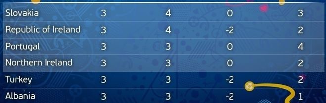 Отсюда следует, что в плей-офф попали сборные Словакии, Ирландии, Португалии и Северной Ирландии, а сборные Турции и Албании по худшим показателям покидают чемпионат Европы по футболу и едут домой.