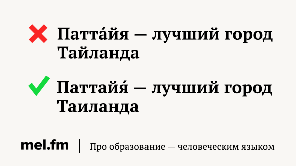 Про правописание любимого русскими туристами Таиланда мы когда-то писали, а в карточке лишь слегка напоминаем. Рейтинг тайских городов мы составлять не планируем, так что с содержанием карточки можно спорить. А мы про русский язык. Ударение в названии одного из самых популярных тайских городов падает на последнюю букву — ПаттайЯ. В тайском языке вообще нет привычных нам ударений, зато есть короткие и долгие гласные звуки. Так вот в названии этого города долгая гласная только одна — последняя. Хотя некоторые словари уже сжалились и добавили второй допустимый вариант: ПаттАйя.