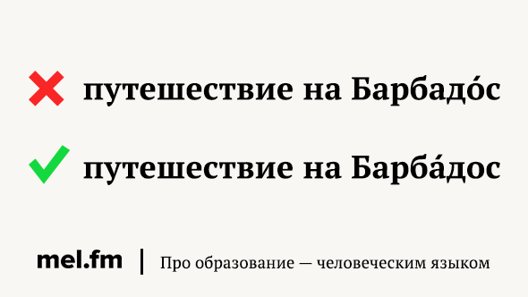 Маленькое островное государство, которое очень полюбилось пиратам Карибского мира. Но сейчас не про пиратские байки, а опять про произношение. Если вы прочитали БарбадОс с ударением на последний слог — поздравляем, вы ошиблись. Правильно ставить ударение на вторую «а»: БарбАдос. А вот прилагательное от слова будет «барбадОсский».