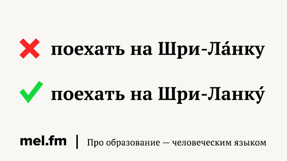 Следующая азиатская страна на очереди — Шри-Ланка. Распространённый вариант ударения (Шри-ЛАнка) вновь не совпадает с нормативным. Верно говорить Шри-ЛанкА. Ударение на последнем слоге сохраняется и во всех падежах: Шри-ЛанкА, Шри-ЛанкИ, Шри-ЛанкЕ, Шри-ЛанкУ, Шри-ЛанкОй и о Шри-ЛанкЕ. Большинство словарей дают такой вариант ударения, но есть и отщепенцы. Например, в Большом российском энциклопедическом словаре (БРЭС) говорится, что допустимо говорить и Шри-ЛАнка, и Шри-ЛанкА.