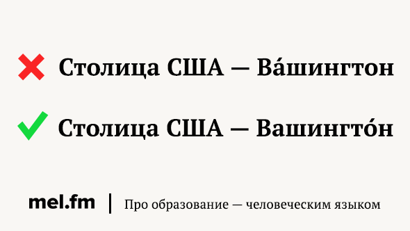 В русском языке столицу США принято произносить с ударением на последний слог — ВашингтОн. Точно так же и одноимённый городу штат. А вот фамилию первого американского президента Джорджа ВАшингтона нужно произносить с ударением на первый слог. Хотя, казалось бы, город назван в честь президента. На самом деле в оригинале, на английском языке, фамилия и город произносятся одинаково — с ударением на первый слог (ВАшингтон). Но в русском языке не все слова произносят и пишут так, как в других языках, и примерно так ВАшингтон частично превратился в ВашингтОн. Такая история.