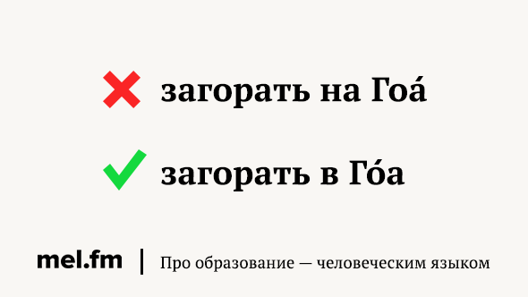 В лингвистических кругах существуют свои «вечные споры». Нужно ли писать «интернет» и «бог» с прописной буквы, как говорить мАркетинг или маркЕтинг, поехать в Белоруссию или в Беларусь. С Гоа обычно допускают три ошибки. Во-первых, ударение ставят на вторую гласную «а», хотя все словари единодушно твердят, что правильно произносить ГОа. Во-вторых, часто говорят «поехать на Гоа», видимо, путая Гоа с каким-нибудь островом. Минутка географии: Гоа — это штат на юго-западе Индии. Поэтому с Гоа нужно употреблять предлог «в». Хотя некоторые филологи не согласны и отвоёвывают право на второй допустимый вариант — предлог «на» (в значении «на побережье»). И, наконец, в-третьих, у Гоа частенько путают род. Гоа — это штат, и всегда мужского рода.