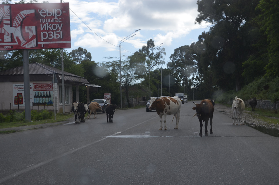 Частая картина в стране, когда скот занимает центральную полосу движения Частая картина в стране, когда скот занимает центральную полосу движенияНо не смотря на все их агрессивное вождение, абхазцы очень отзывчивые и добрые водители. Если вы остановитесь на обочине, включите «аварийку» и поднимете капот, то рядом с вами всегда остановится машина. Местные жители очень гостеприимные, и когда видят, что автомобилю с заграничными номерами нужна помощь, постараются ее оказать. И абхазцы всегда пропускают на пешеходных переходах. Если вы увидели, что перед вами остановилась местная машина, а водитель высунул руку, то знайте, что он кого-то пропускает.