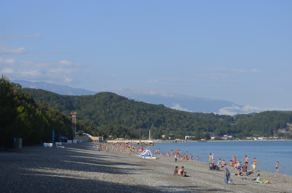 Пляж в Абхазии везде одинаковый, на берегу галька, море чистое. Здесь есть один нюанс, с береговой линии нельзя выходить в купальнике даже на набережную, именно в этом городе это не принято.