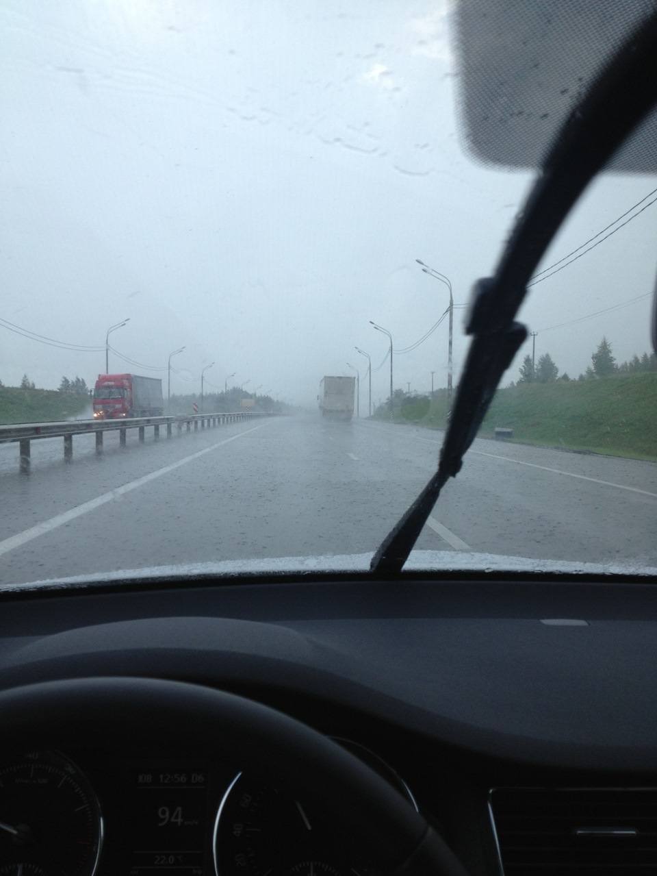 На такой скорости правда даже ровный участок дороги, становится как доска для стирки, поэтому сбрасываюсь обратно до 120 и едем. Счастье продлилось не долго, пришлось сбросить вообще до 50 км/ч, так откуда ни возьмись появилась стена дождя, дворники не справлялись даже на самой максимальной скорости