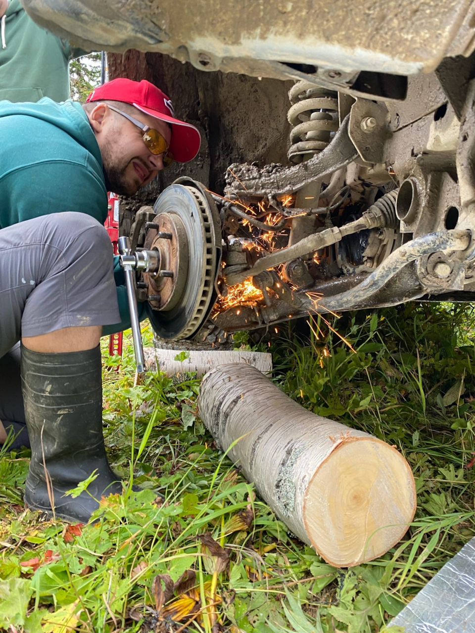 Принимаем решение искать место для ремонта Эльки и снова домкратить, пилить бревна, лезть под машину. Возможно варить.