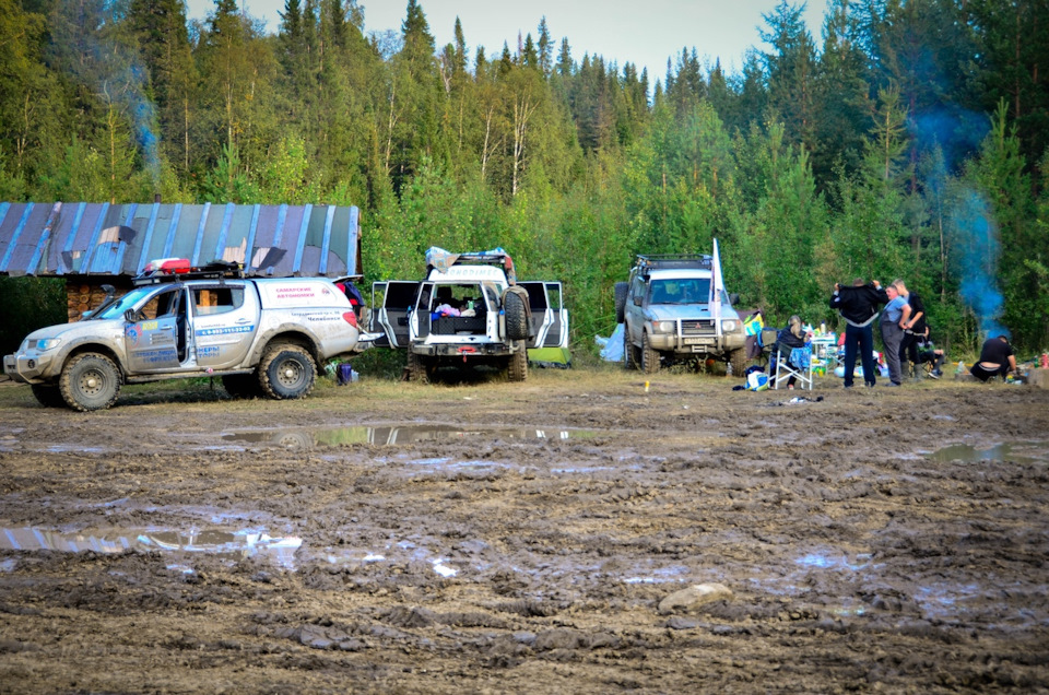 Проезжаем мимо наш лагерь и дальше попадаем в грязь. Все с легкостью ее проехали и только L200 застряла. И тут слышим в радиостанцию: "А у нас передний привод пропал. Мы теперь только на заднем сможем ехать!"