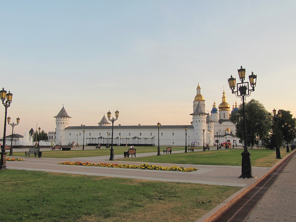 Далее у нас была по плану прогулка по центру вечернего Тобольска. Оплатив номер в гостинице и предупредив, что вернёмся позже, мы выдвинулись в город. Заезжали по берегу Иртыша через пос. Прииртышский, мимо Иоанно-Введенского монастыря. Оставив машину у площади, потопали вокруг первого в Сибири кремля пешком. Реконструкция ансамбля Тобольского кремля недавно завершилась. Когда мы были здесь в 2007-м году, она была в самом разгаре, сейчас же гулять по этим древним местам сплошное удовольствие.