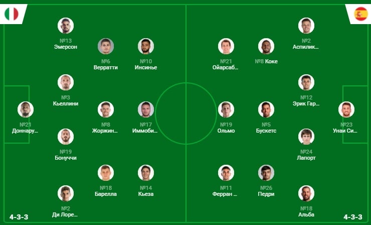 Италия: Доннарумма — Ди Лоренцо, Бонуччи, Кьеллини, Эмерсон (Толой, 74) — Барелла (Локателли, 86), Жоржиньо, Верратти (Пессина, 74) — Кьеза (Бернардески, 107), Иммобиле (Берарди, 61), Инсинье (Белотти, 86).