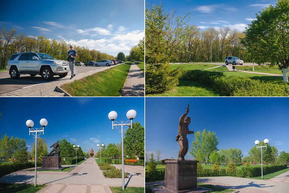 Следующей точкой нашей прогулки станет Парк Победы на другом конце Прохоровки. Но так как село небольшое, то ехать до него всего минут 5. Координаты парковки парка — 51.020879, 36.678903 . Ставим Слоника на стоянке и отправляемся гулять по ухоженным дорожкам парка. Повсюду зеленые газоны с оросительными системами, недавно посаженные фруктовые деревья, новенькие лавочки, все подстрижено и очень чисто.