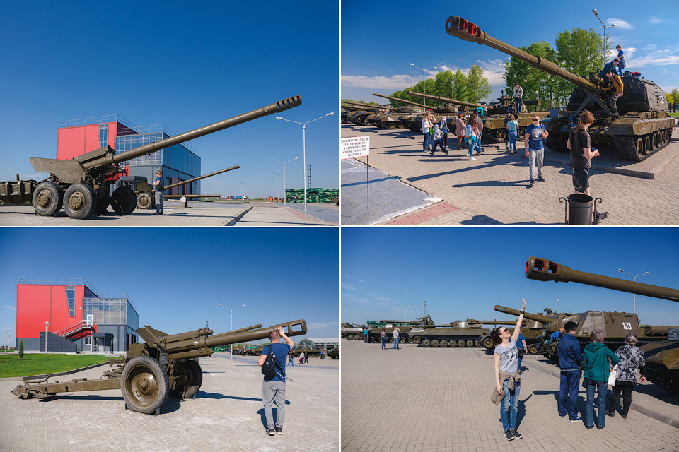 И в правду, люди с огромным интересом разглядывали представленные танки и бронемашины, забирались на корпус техники, хотя везде были расставлены таблички с предупреждением, что лазить по бронетехнике опасно для жизни. Но разве ж это кого остановит =) Особенно детям было очень интересно рассмотреть, дотронуться до частички истории, напоминающей о былых сражениях. Здесь представлены как легендарные танки Т-34-85, так и более поздние модели техники. И все пользуется огромной популярностью у туристов, судя по фотографиям. Некоторые пушки невероятно огромные!