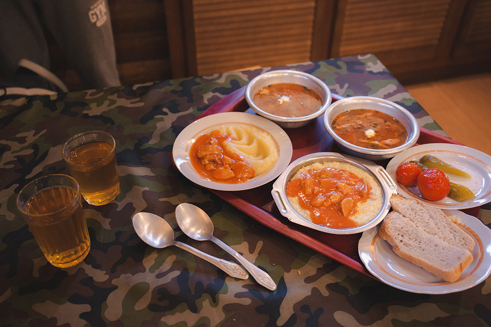 Наконец, настало время покушать! На столах – немудреная солдатская посуда: алюминиевые кружки, ложки, конечно, гранёные стаканы, в своё время именуемые «малиновскими». Обслуживают посетителей девушки-официантки в военной форме. А у нас на подносе солдатская каша с подливкой, пюре картофельное с поджаркой, две солянки, соленья прямо из 3х-литровой банки, яблочный сок и белый хлеб. Сказать, что это было вкусно — ничего не сказать! Это было ВЕЛИКОЛЕПНО! Не знаю, то ли мы находились полтора-два часа уже и ооочень проголодались, но нам действительно было вкусно. Смели все это за 5 минут — тоже по-солдатски :) Вся эта вкуснота обошлась нам на двоих всего в 400 рублей. Отличное кафе, рекомендуем! Кстати, кто не за рулем — тем можно взять солдатские 100г водки, которые подают в железных кружках ;-Р