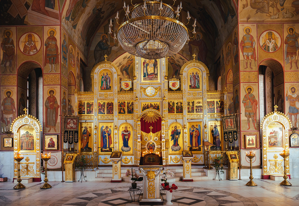 Внутри так же очень спокойно и почти никого нет, весь народ сосредоточен в музеях и на полигоне с орудием. Когда зашли внутрь, повсюду разносились удивительные песнопения, кристально чистые голоса действовали умиротворяюще. Здесь царит атмосфера мира, пахнет благовониями и гораздо прохладнее, чем на улице (в тот день было +25С точно). Вообще, мне очень нравятся храмы с точки зрения архитектуры и красоты художественного оформления стен, икон, убранства. Ведь это чей-то кропотливый труд. В 2000 году в храме была закончена роспись, которая производилась в течение полутора лет бригадой иконописцев. Надо сказать, получилось очень красочно и нарядно.