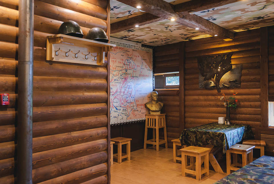 Здесь всё соответствует тому, чтобы ветераны войны, все, кто в своё время воевал в горячих точках за пределами и внутри страны, молодёжь могли соприкоснуться с историей, одной из самых значимых на любой войне стороной боевых будней. Здесь по особому уютно, всё напоминает о былом. Стилизованные под блиндаж бревенчатые стены с керосиновыми лампами, окошки-бойницы, из натурального дерева сколоченные столы. На стенах – атрибуты военной поры: плащ-палатки, автоматы, исполненные из окопных трофеев миниатюры в виде горельефов.