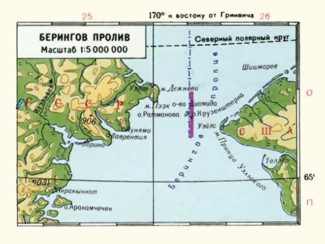 Принято считать, что как раз Берингов пролив и отделяет русских от американцев. Но, оказывается, что этот пролив омывает острова, сокращающие промежуток между странами в 20 раз. А граница, которая проходит между островов еще является и линией смены дат.