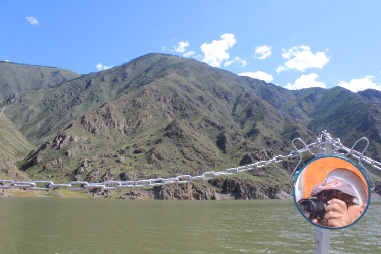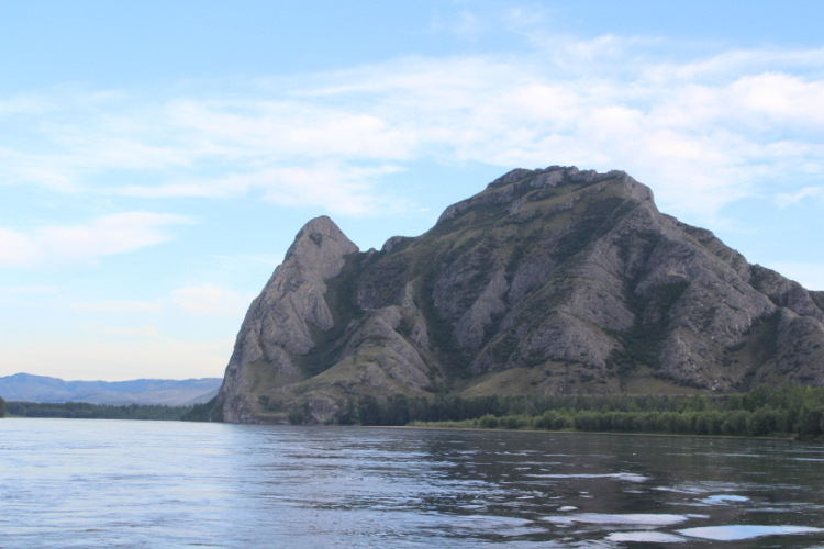 Ближе к обеду мы отправили Булыча на Патриоте с прицепом в дорогу до Саяно-Шушенского водохранилища и втроем отошли от берега. Первые же километры по Енисею показали, что путешествие не будет легкой прогулкой, огибая один из многочисленных островов, зацепили мель, да так, что даже с поднятой "ногой" катер умудрялся застревать на перекатах. И это при нашей осадке не более 20 сантиметров. Спросили у рыбака, где основное русло? На что он ответил, что мы и находимся на основном. Признаюсь, я слегка загрустил, до водохранилища еще далеко, а мы застряли на самых подступах к Кызылу. Но потихоньку-помаленьку река сузилась, течение стало быстрее, катер разгонялся до 20 км/час, а, самое главное, стало поглубже. Здесь же мы обнаружили, что у нас не работает эхолот, возможно где-то перетерся кабель от датчика, причем температуру воды показывал постоянно, а глубину только периодически.