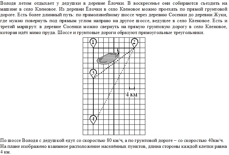 По шоссе Володя с дедушкой едут со скоростью 80 км/ч, а по грунтовой дороге \hbox < минус минус минус >со скоростью 40 км/ч. На плане изображено взаимное расположение населённых пунктов, длина стороны каждой клетки равна 4 км.