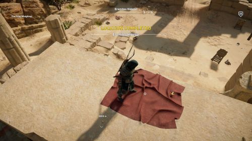 Как вы можете видеть чуть ниже на скриншоте, убежище расположено к западу от Крокодилополиса в регионе Файюм. Выйдите из города, а затем направляйтесь на запад и поднимитесь наверх по скале. Вскоре вы окажитесь посреди древних руин. Проверьте верхушку арки и вы отыщите красное одеяло, окруженное свечами. Взаимодействуйте с этим местом для получения очка умений.