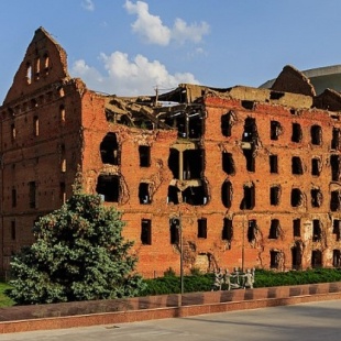 Полуразрушенное здание сталинградской мельницы из красного кирпича. Мельница была построена в 1904 году немцем Гергардтом. При восстановлении города после войны мельницу решили оставить как есть в качестве живого свидетельства разрушительной Сталинградской битвы. Местонахождение этого памятника и определило место для создания музея сталинградской битвы, одним из экспонатов которого стало и здание мельницы. Информация