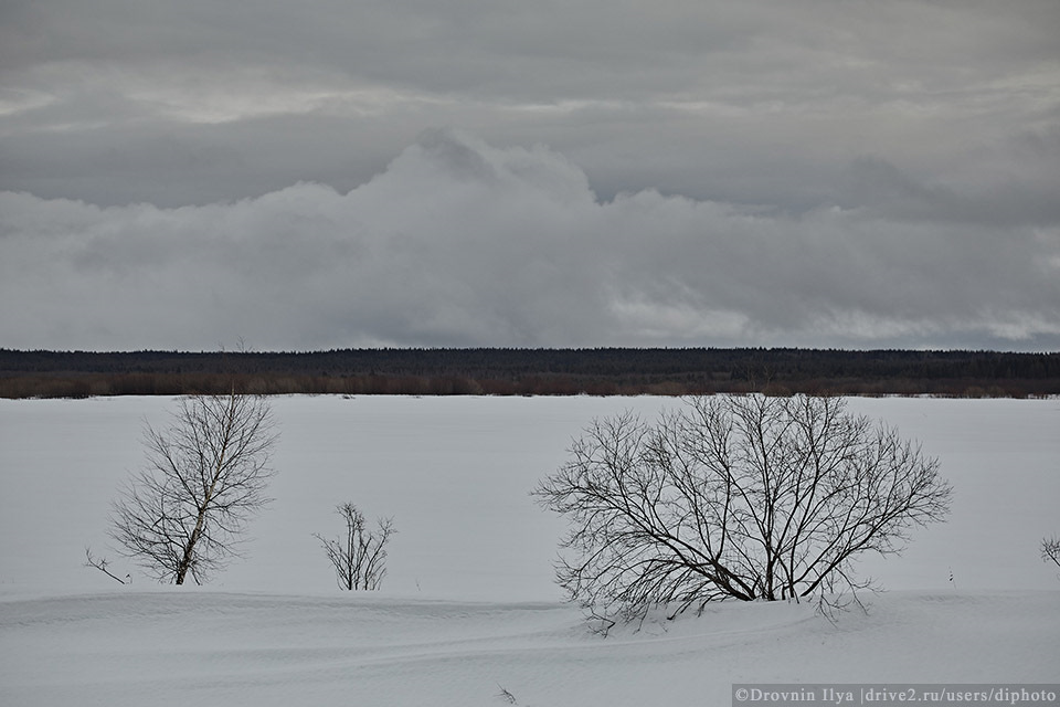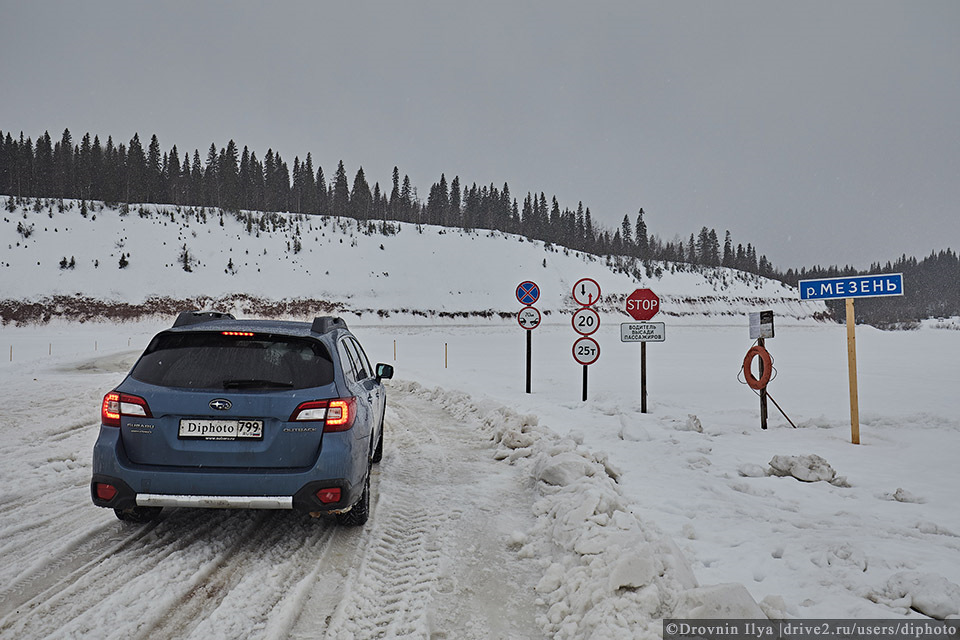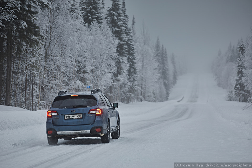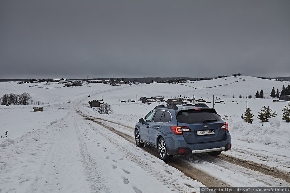 18.И сейчас, когда должны быть самые лучшие зимники, мы едем по лужам и снежной каше с колеями. Полный привод Subaru Outback как никогда, кстати, на этих дорогах. Еще немного и придет распутица, так что вообще ни на чем не проедешь. Мы не смогли проехать коротким зимником в Лешуконье и поехали в объезд. Встретили тут местных жителей, которые тоже хотели поехать там, но развернулись. Все же иногда лучше перестраховаться. В тайге, кроме как самому, помочь будет некому.