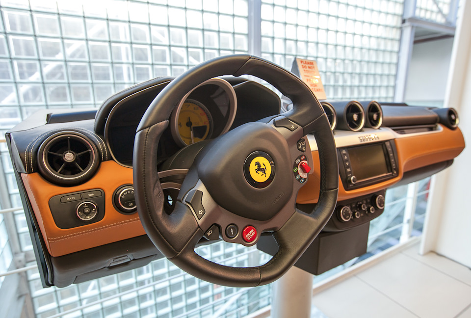 Отмечу, что, внимательно рассмотрев салон кабриолета, я не мог не обратить внимание на особенности ручной сборки: километровые щели, следы клея, кривая строчка — это далеко не полный список изъянов, делающих этот интерьер по-настоящему живым, "ламповым". Словно для подтверждения моих выводов рядом был установлен макет более современной и гораздо более качественно выполненной приборной панели от Ferrari FF.