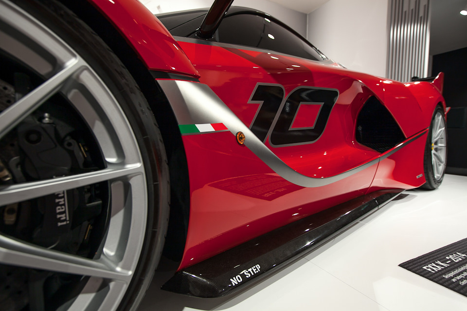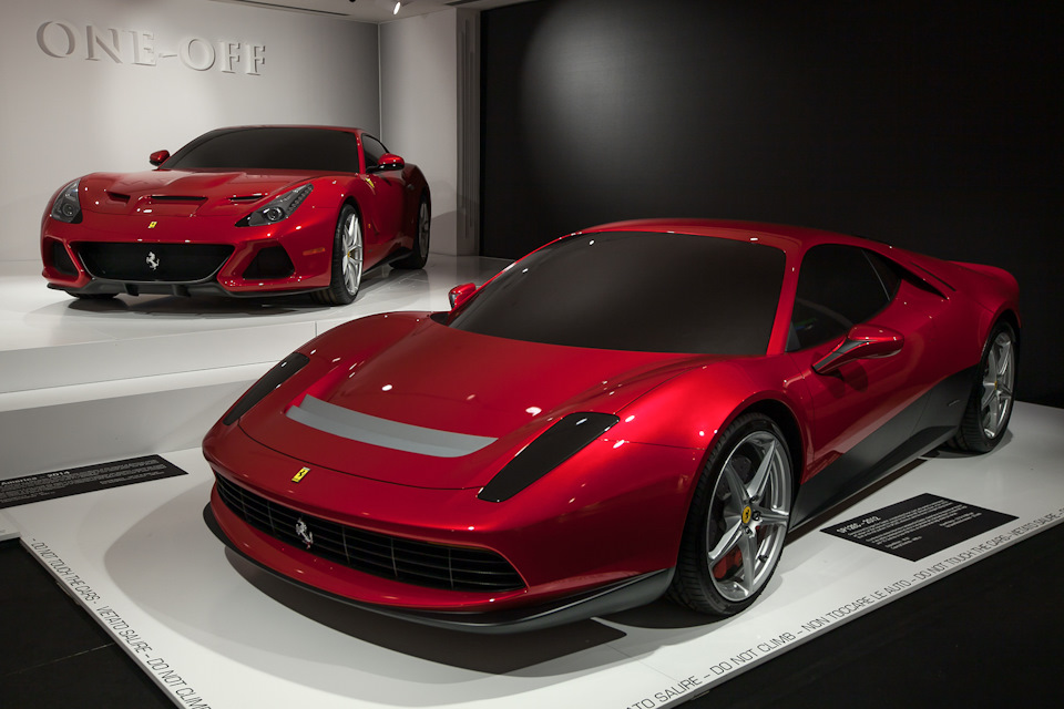 Наконец мы перешли в последний выставочный зал, где от форм и обводов концептуальных моделей Феррари просто срывает крышу. А этот цвет… Удача, если моя пленка на БМВ будет хотя бы приблизительно похожа на этот восхитительный красный! Первая пара автомобилей, встречающая гостей при входе — это Ferrari SP12EC и Ferrari SP America. Первый автомобиль — спецзаказ давнего клиента Феррари, певца Эрика Клэптона, созданный в 2012 году на базе 458 модели и отображающий страсть певца к модели 70х годов Ferrari Berlinetta Boxer. Второй же автомобиль — американский заказ 2014 года, напоминающий о классической Ferrari 250 GTO в современной интерпретации. Вообще же аббревиатура SP расшифровывается как Special Projects, самое лучшее из лучшего.