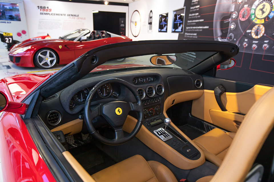 Следующий зал встретил нас ограниченной версией кабриолета Ferari 599 GTB Fiorano, названной SA Aperta в честь Сержио и Андрэа Пининфарина. Рядом с ней стояла не менее лимитированная версия Ferrari 550 Maranello — полностью открытая Ferrari 550 Barchetta Pininfarina, созданная в честь 70-летия известного дизайн-ателье.