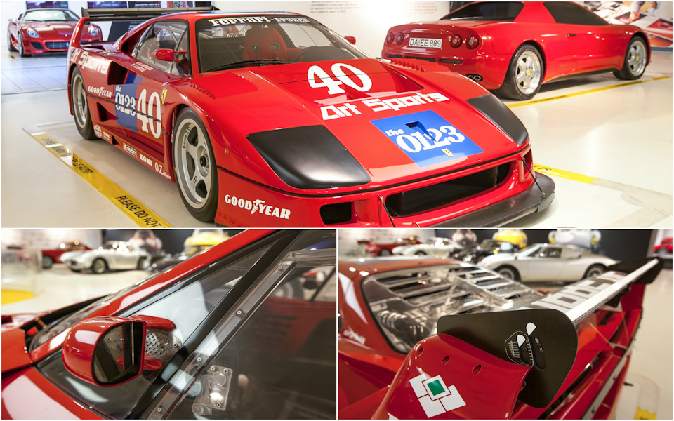Помимо вышеуказанных раритетов в зале также стояла пара концептуальных уродцев Ferrari GG50 работы маэстро Giorgetto Giurgiaro и Ferrari 360 Modena by Italdesign, на фоне которых совершенно фантастически выглядела гоночная версия легендарной F40 — Ferrari F40 LM, оснащенная трехлитровым V8, выдающим на-гора ажно 720 лошадиных сил и разгоняющим автомобиль до умопомрачительных 367 километров в час. На этот автомобиль не было жаль потратить свое время для того, чтобы рассмотреть его в мельчайших подробностях, восхищаясь деталями. А какое у него антикрыло с тонкой настройкой, куда там моему скромному крылышку на БМВ…