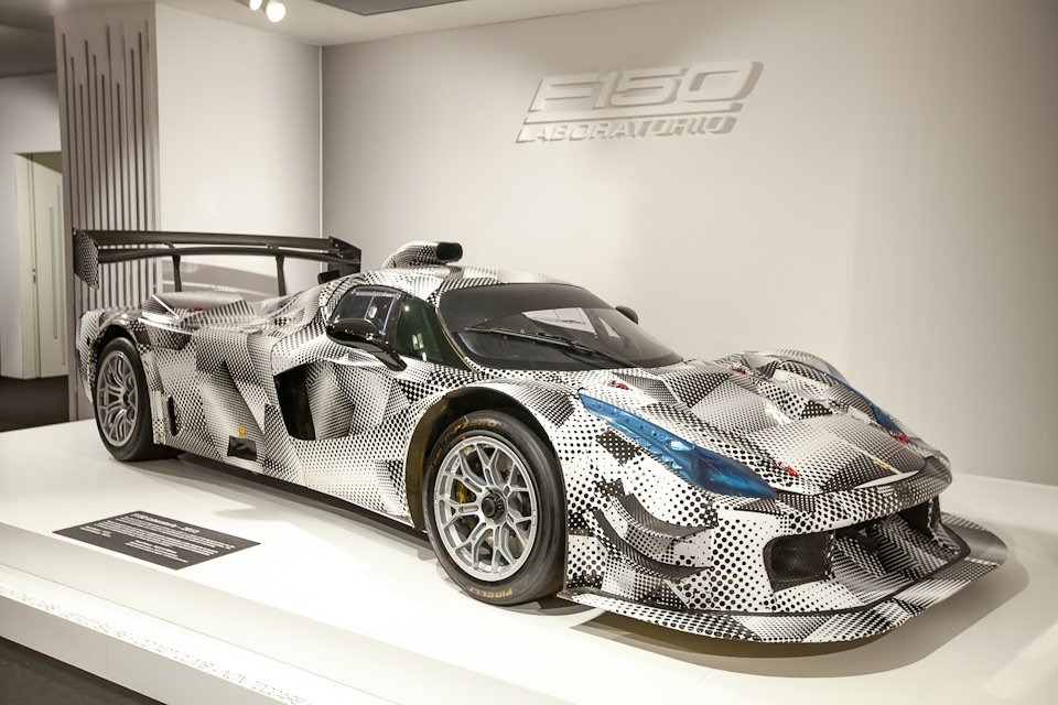 Разбавляет компанию кроваво-красных автомобилей закамуфлированный Ferrari F150 Laboratorio, созданный в 2013 году прототип Ferrari FXX K, трековой версии Ferrari LaFerrari.