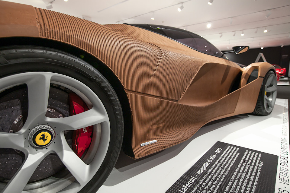 Рядом с выходом из зала расположен рабочий макет Ferrari LaFerrari, наглядно показывающий этап разработки дизайна кузова в виде пластилинового макета. Накладки на дисках сделаны из картона.