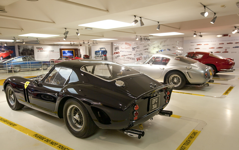 Далее мы перешли в следующий, наиболее обширный, зал, в котором представлены автомобили 60х годов, например красная Ferrari 250GT Berlinetta Tour de France 1956 года, серебристая Ferrari 250GT Berlinetta passo corto (SWB) 1959 года и черная Ferrari 250GTO 1962 года.