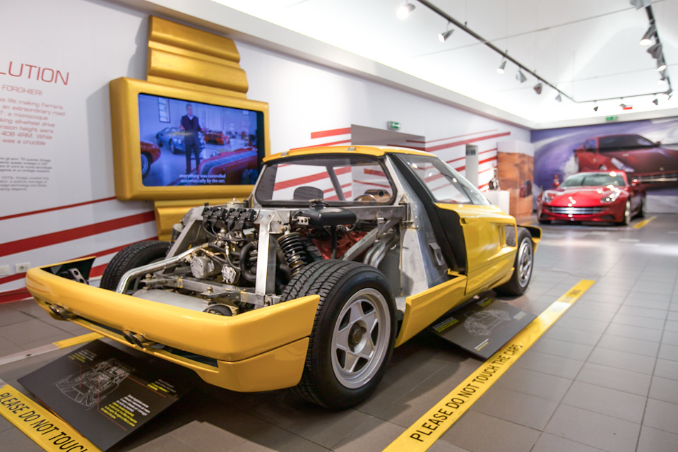 На этом первый этаж музея заканчивается и по лестнице мы попадаем на второй этаж, который встречает нас репродукцией кабинета самого Энцо Феррари, а также двумя автомобилями разных эпох, схожих общей идеей: наличием полного привода — современная красная Ferrari FF, V12 невероятного для Феррари объема в 6.3 литра; и эксклюзивная желтая Ferrari 408 4RM с 4-литровым V8 на борту.
