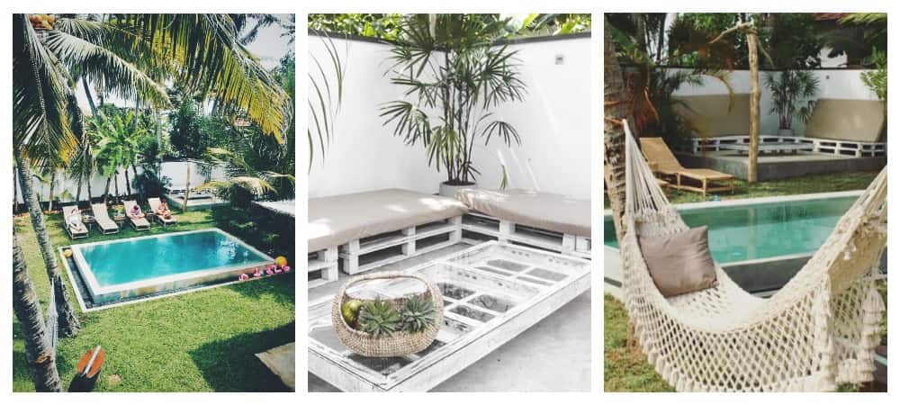 - Бассейн, сад, чилл-зона с пуфами и гамаками, настолки;