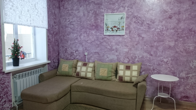 "Студия" (большой однокомнатный номер, поделен на две зоны: гостиная и спальная зона. В спальной зоне большая двуспальная кровать, в гостиной зоне мягкая мебель, холодильник, TV, кондиционер. В номер душевая кабина, сан/узел, туалетные принадлежности)