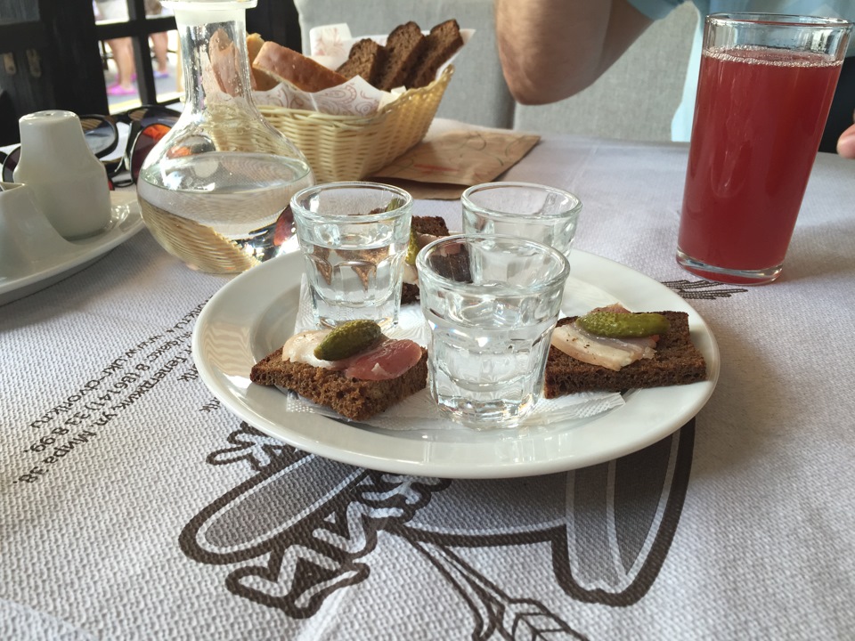В Дворике нас даже поприветствовали домашним самогоном с салом (комплимент от ресторана).