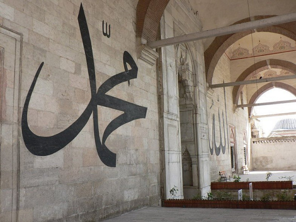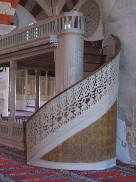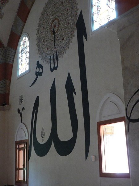 Надписи - "османский лебедь" - символ веры (Нет Бога кроме Аллаха, а Магомет - пророк его!) на торцевой стене мечети. Снизу - полочки для обуви.