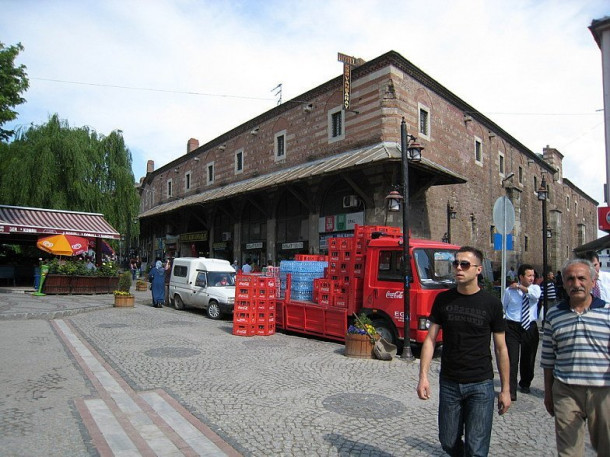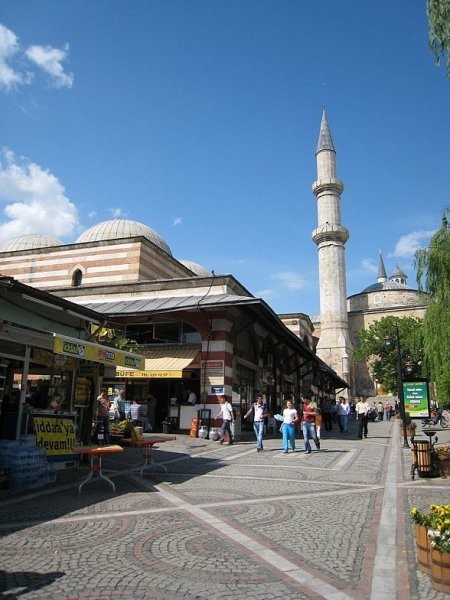 Выходя на эту дорогу, мы пересекли площадь перед 14ти купольным бедестеном - крытым рынком, построенным из тесанного красного и белого камня автором Эски Джами - архитектором Хаджи Алладином в 1417-1418 годах по повелению султана Мехмеда Челеби.